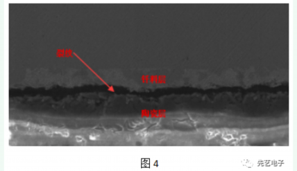 對于常規(guī)的釬焊封裝結(jié)構(gòu),一般界面空洞是失效的源頭,但是對于AMB陶瓷覆銅載板,溫度沖擊下的界面失效通常發(fā)生在銅的邊角處,如圖3樣品在溫度沖擊后的界面C-SAM圖片,這是由于邊角處是陶瓷和銅熱失配應(yīng)力的主要集中位置,與AMB陶瓷覆銅載板在溫度沖擊下的熱應(yīng)力模擬分析結(jié)果是一致的。對于Si3N4-AMB陶瓷覆銅載板,界面剝離一般發(fā)生在釬料層與Si3N4陶瓷表面的互連界面處(如圖4),但是對于AlN-AMB陶瓷覆銅載板,由于AlN的機(jī)械強(qiáng)度不如Si3N4陶瓷,且陶瓷自身脆性較強(qiáng),界面剝離則一般發(fā)生在陶瓷側(cè)內(nèi)部,剝離形式也呈現(xiàn)出偏韌性剝離和脆性崩裂的差異。