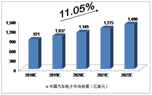 我們預(yù)計(jì),2018年我國汽車電子市場(chǎng)規(guī)模將達(dá)到921億美元,未來五年(2018-2022)年均復(fù)合增長率約為11.05%,2022年將達(dá)到1,400億美元。
