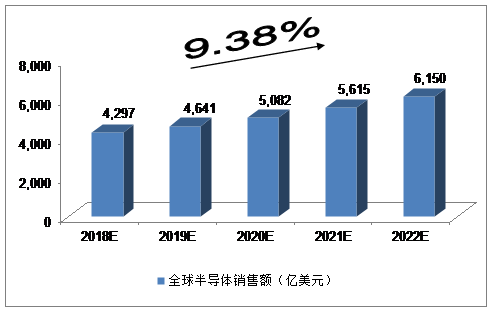 我們預(yù)計(jì),2018年全球半導(dǎo)體銷售額將達(dá)到4,297億美元,未來五年(2018-2022)年均復(fù)合增長率約為9.38%,2022年將達(dá)到6,150億美元。