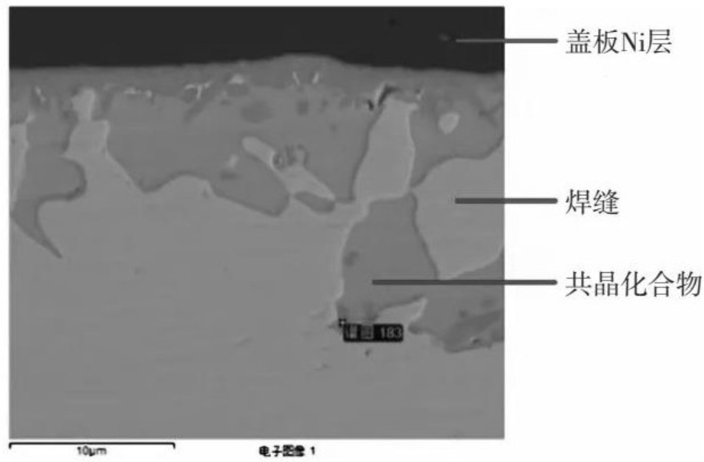 樣品處理完成后,通過掃描電子顯微鏡觀察焊接界面的形態(tài),然后進(jìn)行分析。首先, 以峰值溫度330℃的典型樣品為例,通過掃描電子顯微鏡觀察到的焊料界面形態(tài)如圖4 所示。從圖中可以看出,蓋板與焊料之間已經(jīng)良好結(jié)合,蓋板鍍Ni 層與焊縫形成了清晰的界面。
