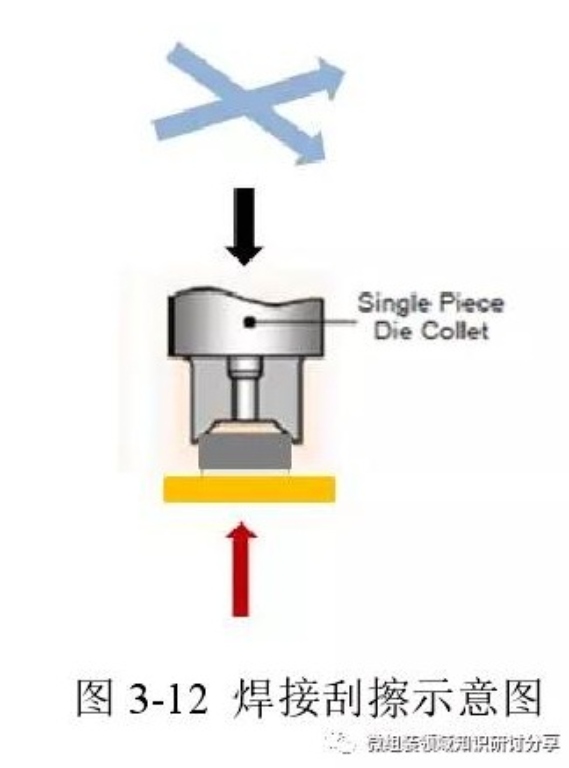 刮擦參數的設置。使用吸嘴吸附芯片進行刮擦的目的:一是用來提供額外的回流熱量;二是使芯片和載體之間的焊料充分潤濕形成有效焊接;三是將熔融焊料中的氣泡驅趕出去減小 焊接空洞率。一般情況下會采取“X-Y”方向、“X”方向、“Y”方向三種模式,操作示意圖如圖3-12所示,紅色箭頭表示加熱,黑色箭頭表示施加壓力,藍色箭頭表示刮擦方向。